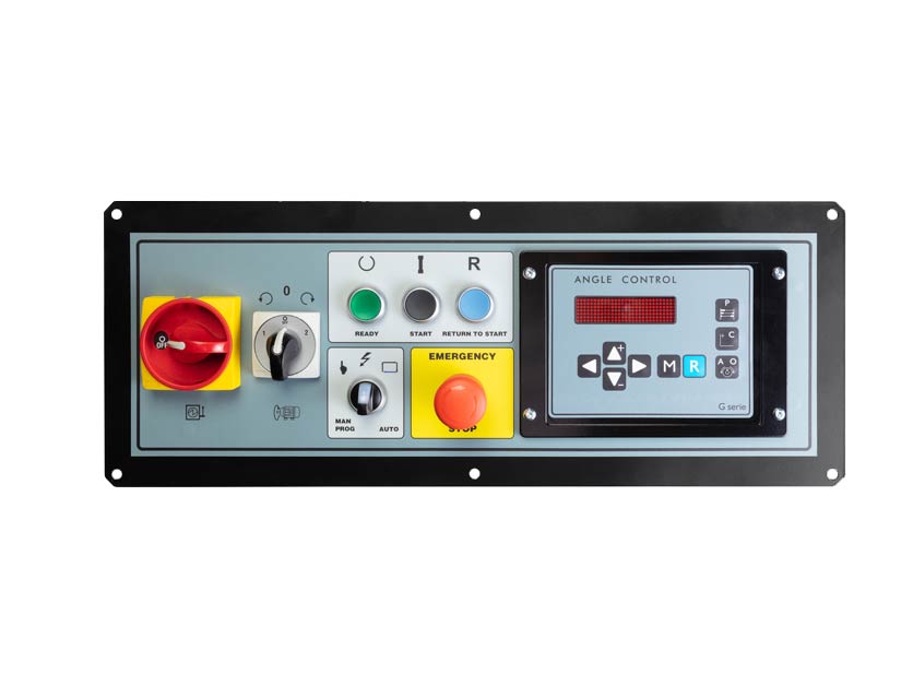 Ugaona kontrola je napredni elektronski programator. Napravljen je korišćenjem najsavremenijih tehnika i elektronskih kola, u skladu sa standardima bezbednosti za operatere. Ova upravljačka tabla omogućava memorisanje do 10 uglova savijanja u bilo kom redosledu, obezbeđujući izuzetnu preciznost zahvaljujući čitaču koji zaustavlja mašinu čim se postigne željeni ugao.